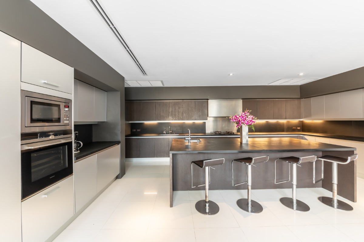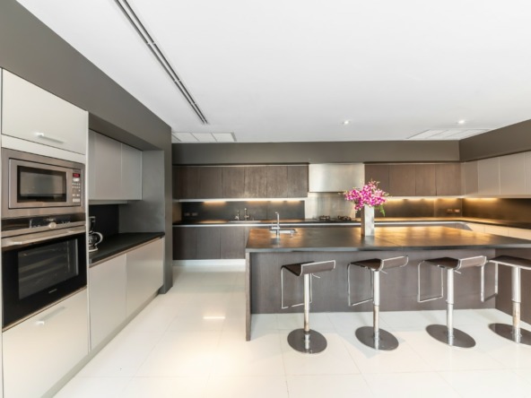 Down a stairway is access to bedrooms 4 and 5.  Each has solid sea views and spacious terraces/ balconies.  Bedroom 5 has an ocean-view bath in addition to the shower. Behind bedroom 4 is a home theatre/ TV room with additional storage. At the rear of the main living level, stairs lead down to a large kitchen and pantry. Further stairs lead to a spacious, well-lit, airy gym and two maids’ rooms. At the rear of the villa is a walkway to a mountain-facing sala for guests to read and relax away from the main villa.