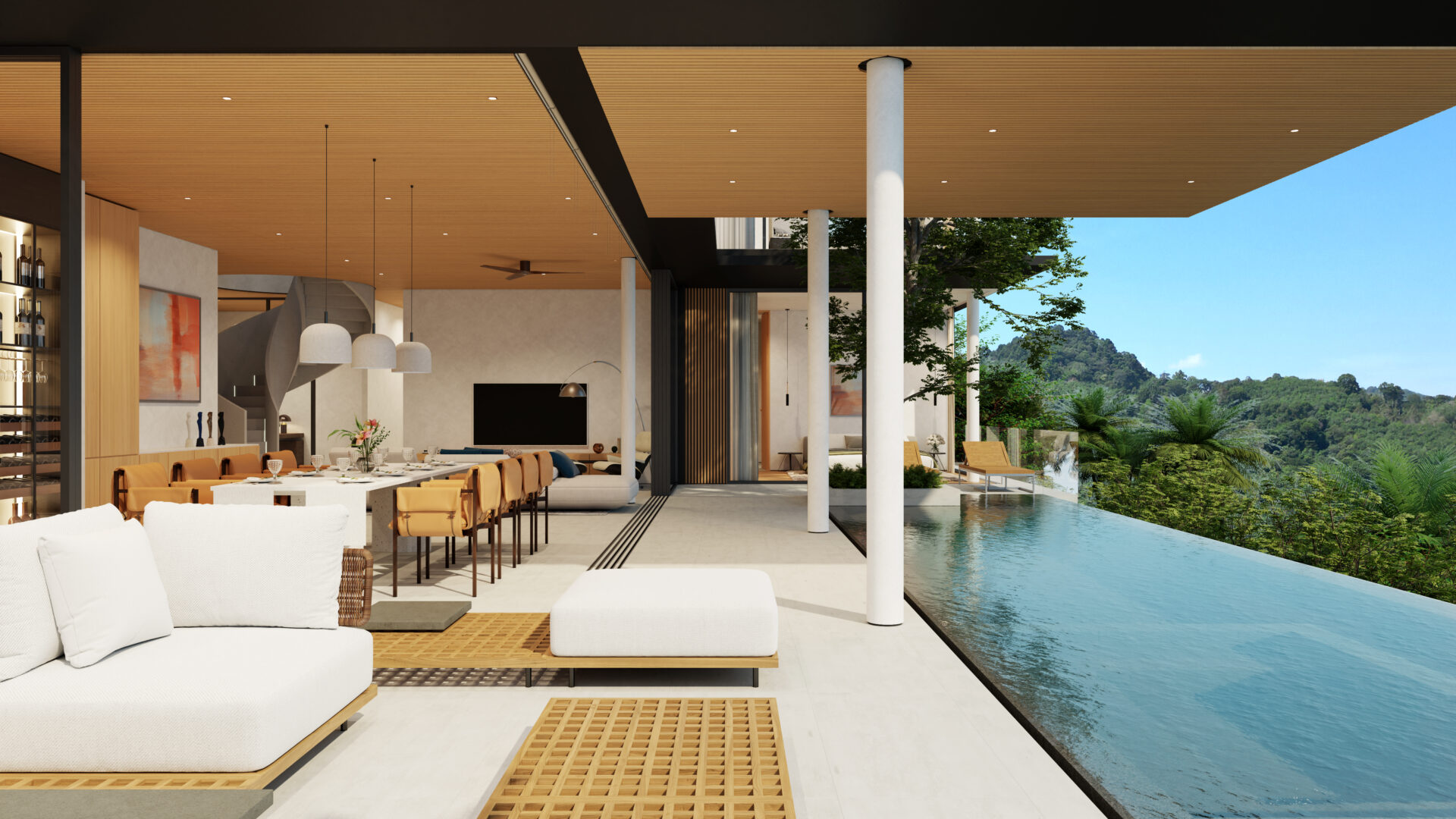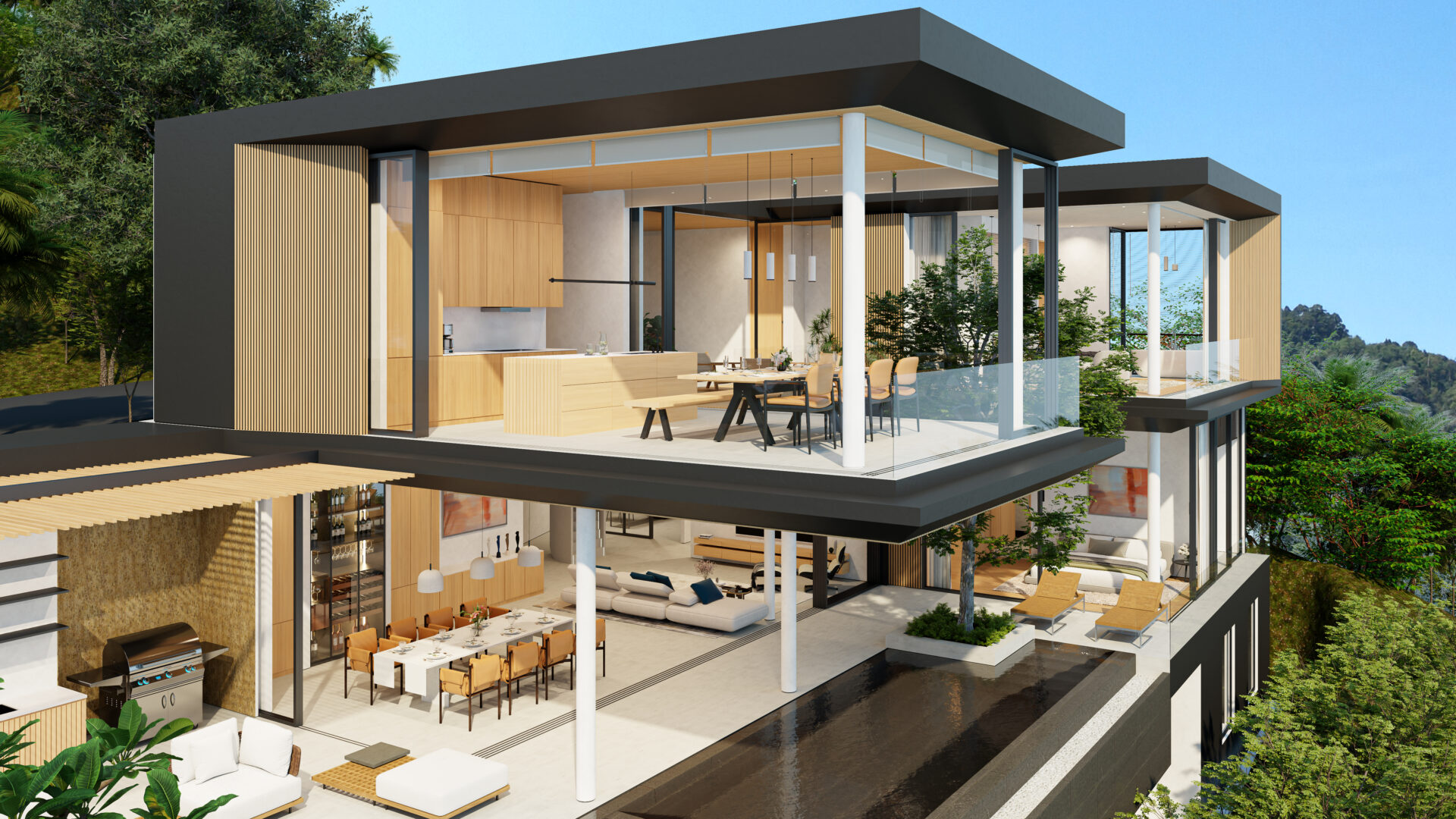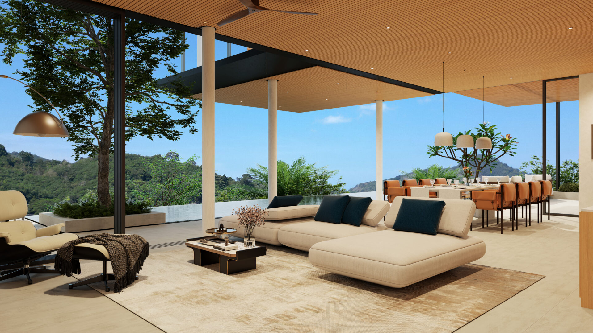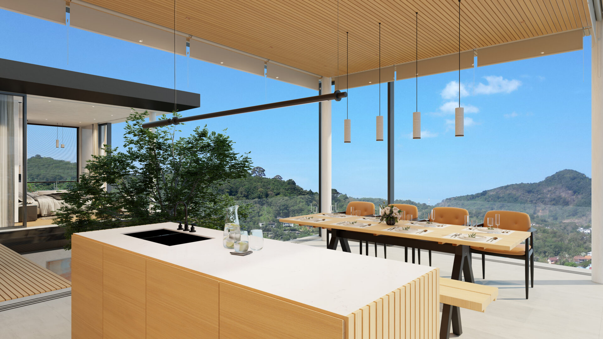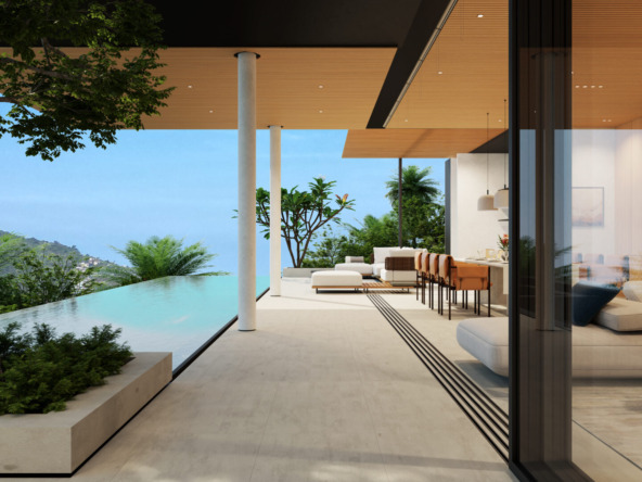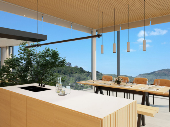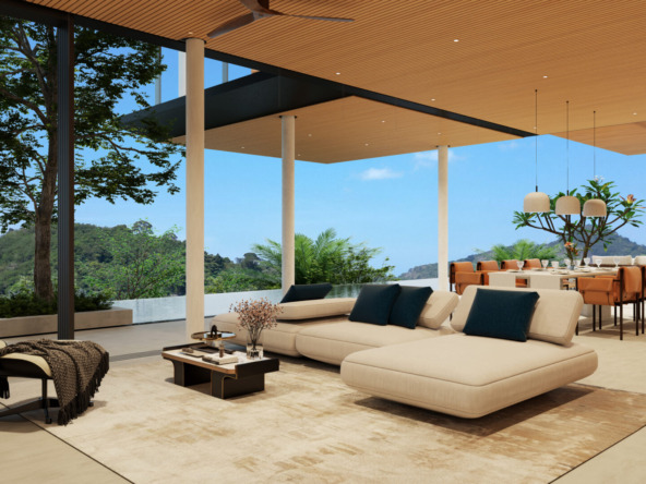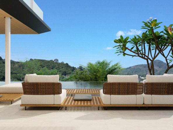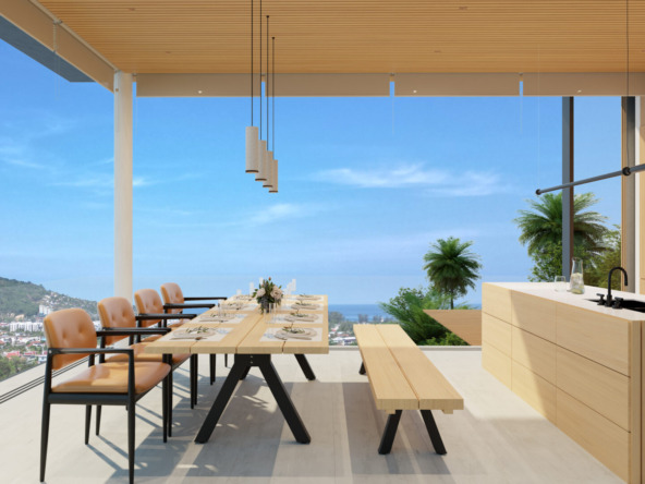 This stunning villa features a unique floating kitchen above the treetops, complemented by a breathtaking 15-meter infinity pool that blends seamlessly with panoramic views of Kamala Bay and lush mountains.