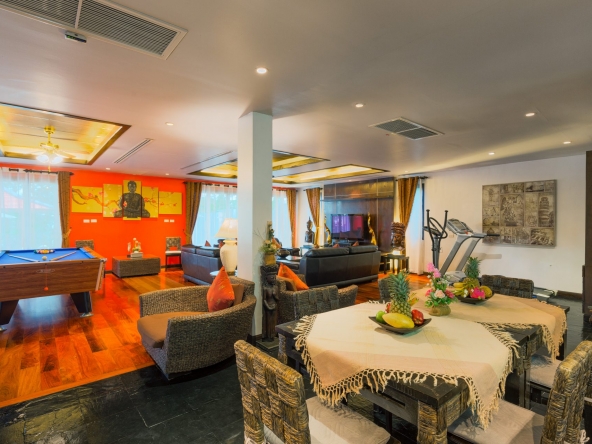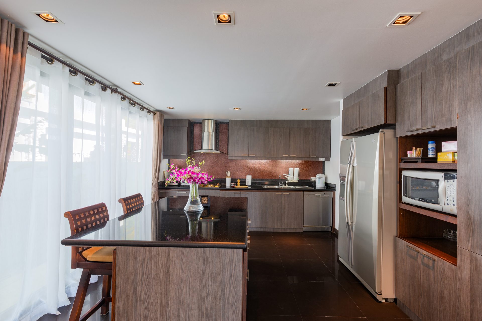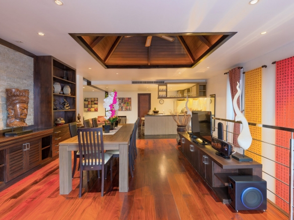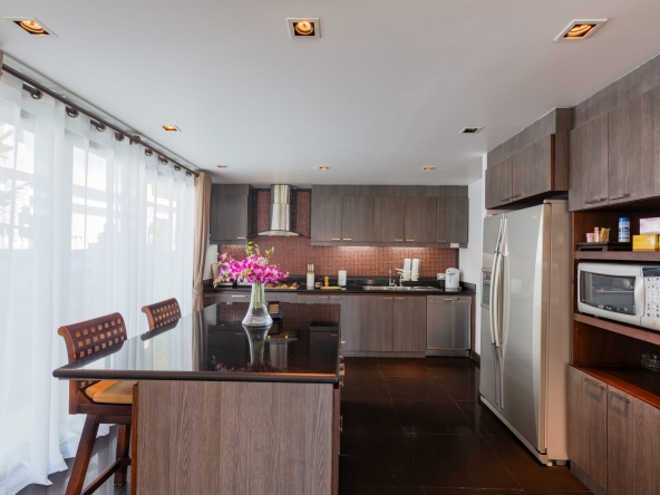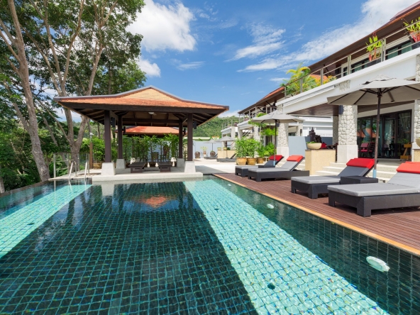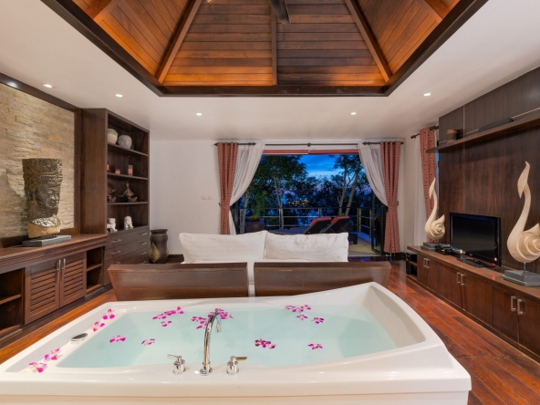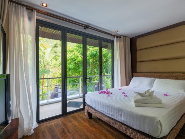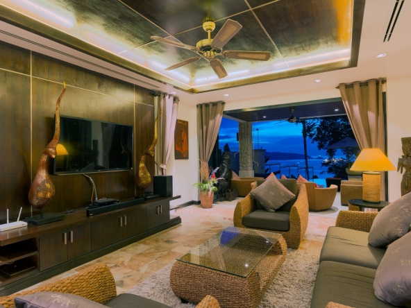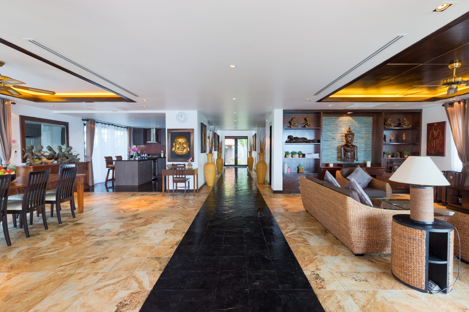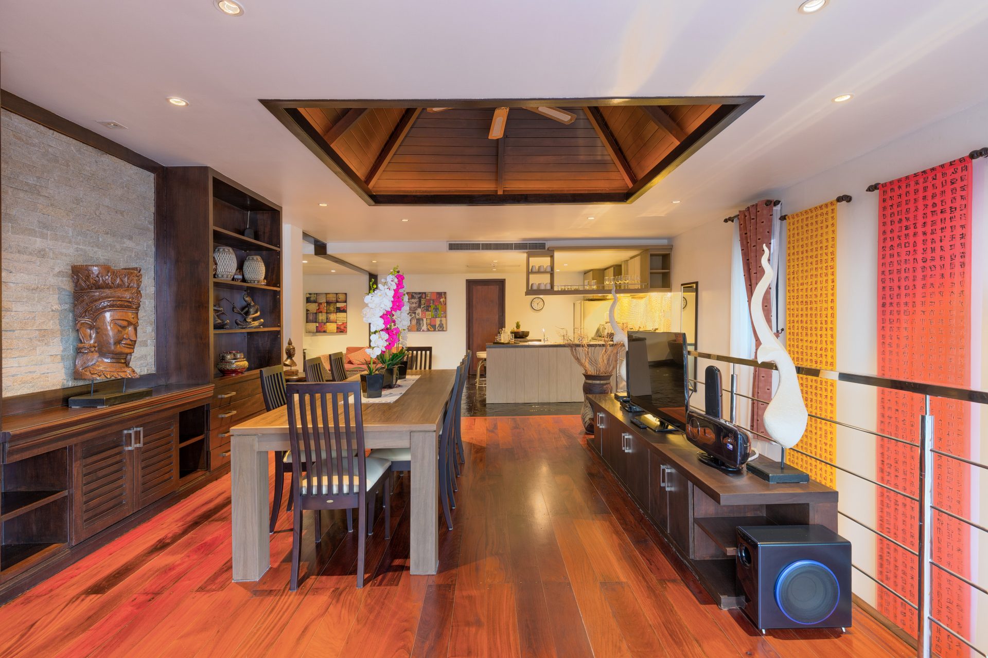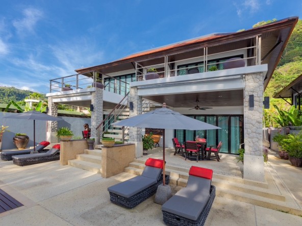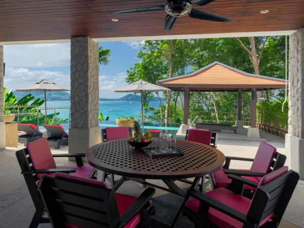 The 6-bedroom villa offers two large master bedrooms with full ensuite bathrooms and two guest bedrooms on the upper level.  There are two further bedrooms on the ground floor level. Both master bedrooms share a large balcony overlooking the Andaman Sea. The villa offers two large dining areas – one indoor and one outdoor – allowing you to choose the best setting for an enjoyable meal with friends and family. A fully equipped kitchen is available should you wish to cook your own meals. A BBQ is also available on the outdoor terrace.