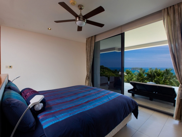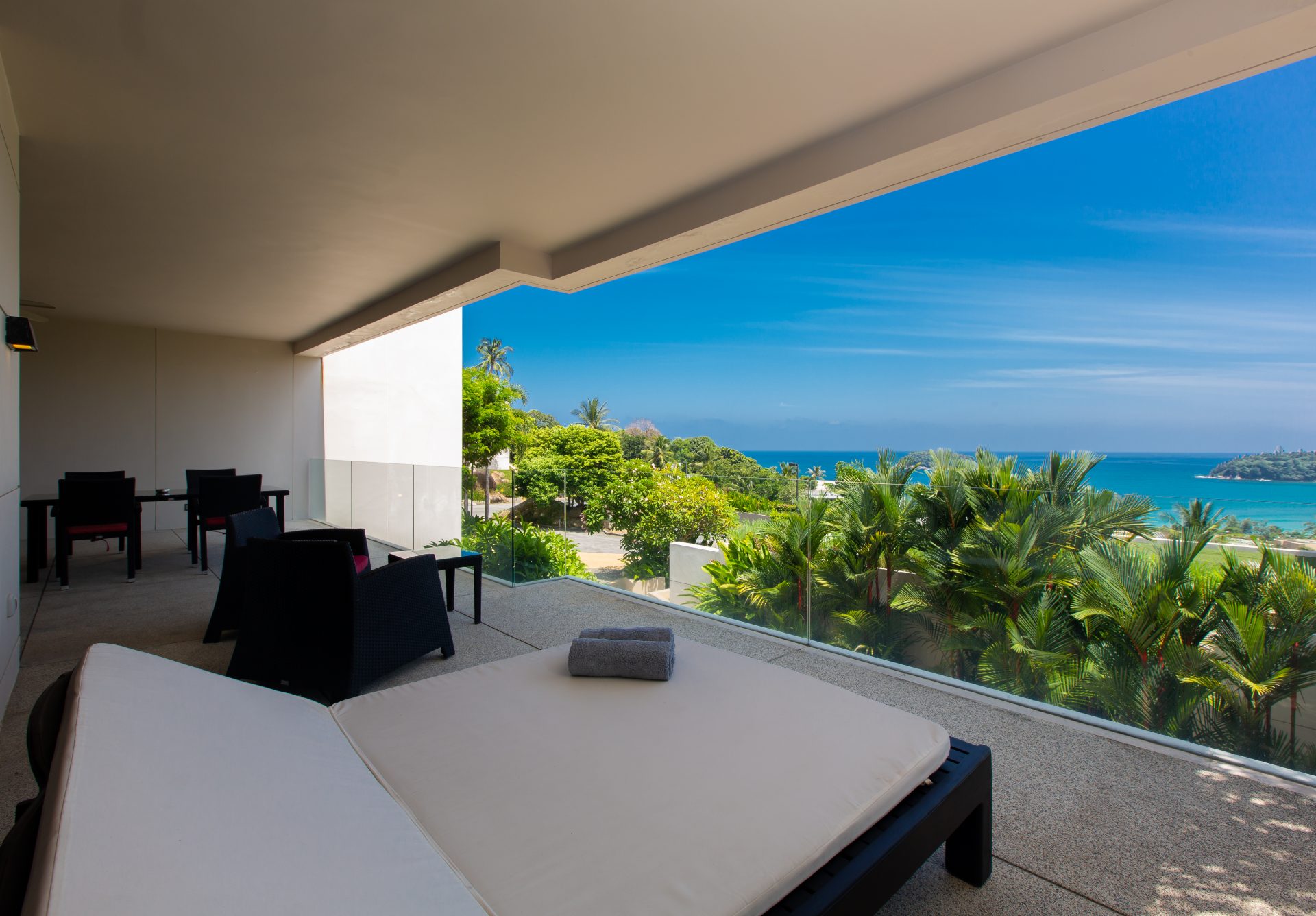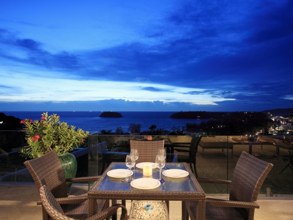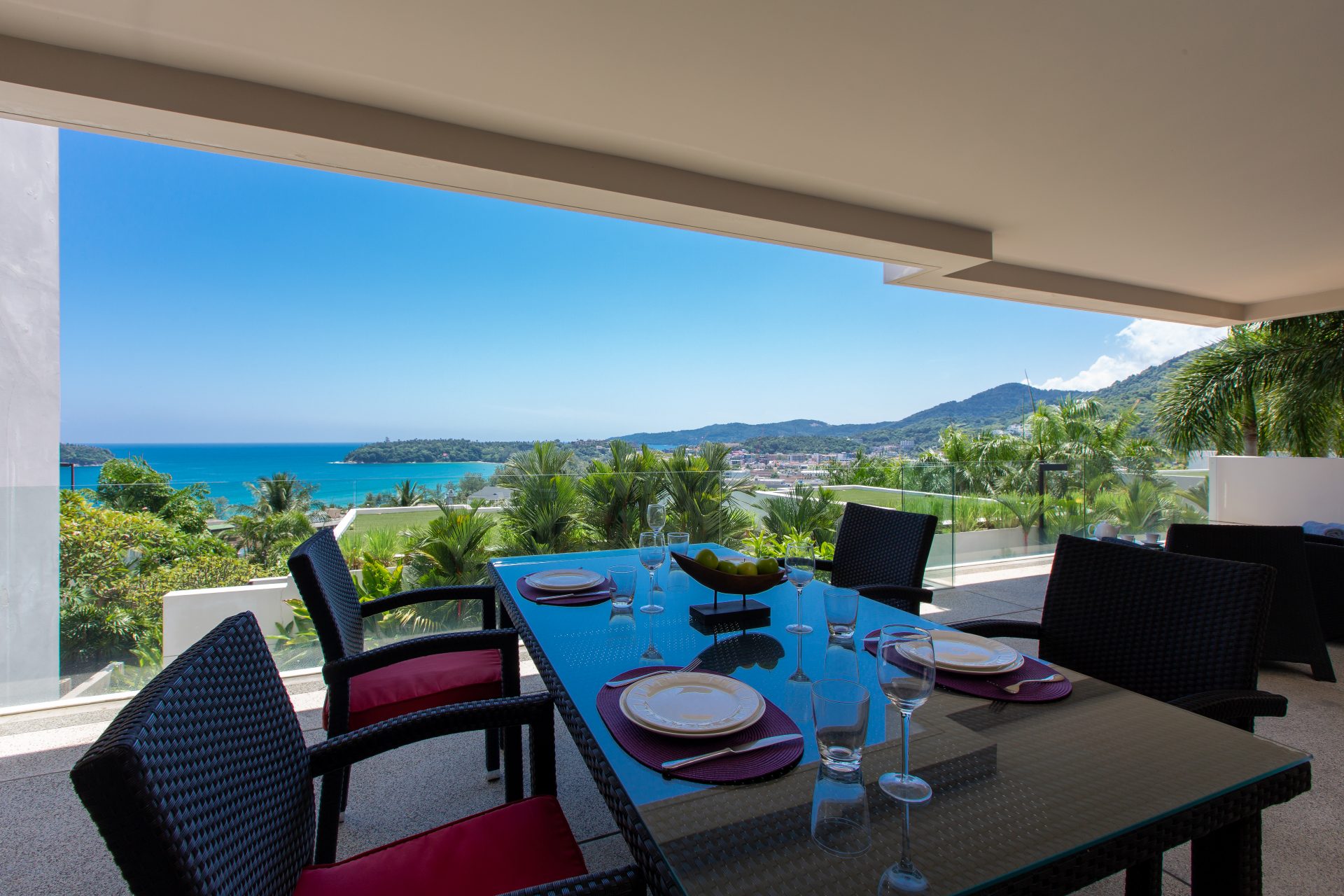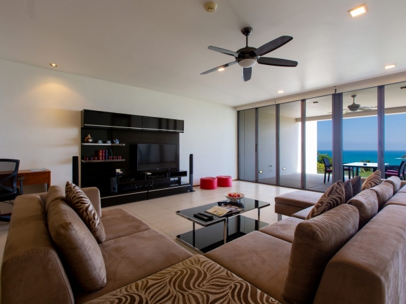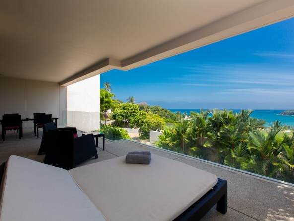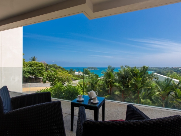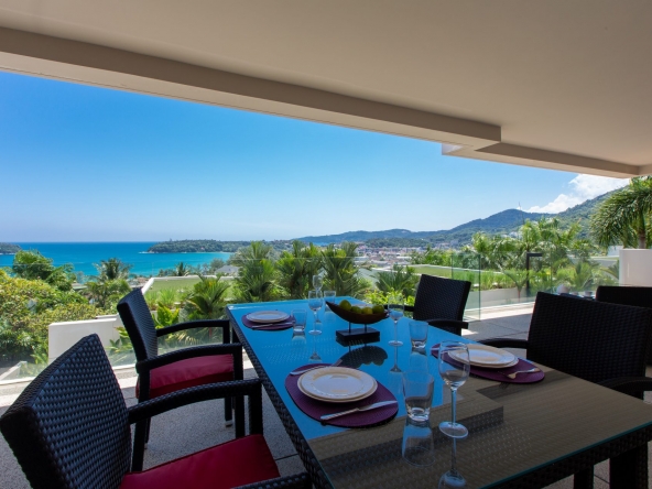 Modern 2-bedroom 2-bathroom ocean and mountain-view apartment in Kata featuring open-plan living area with large terrace.