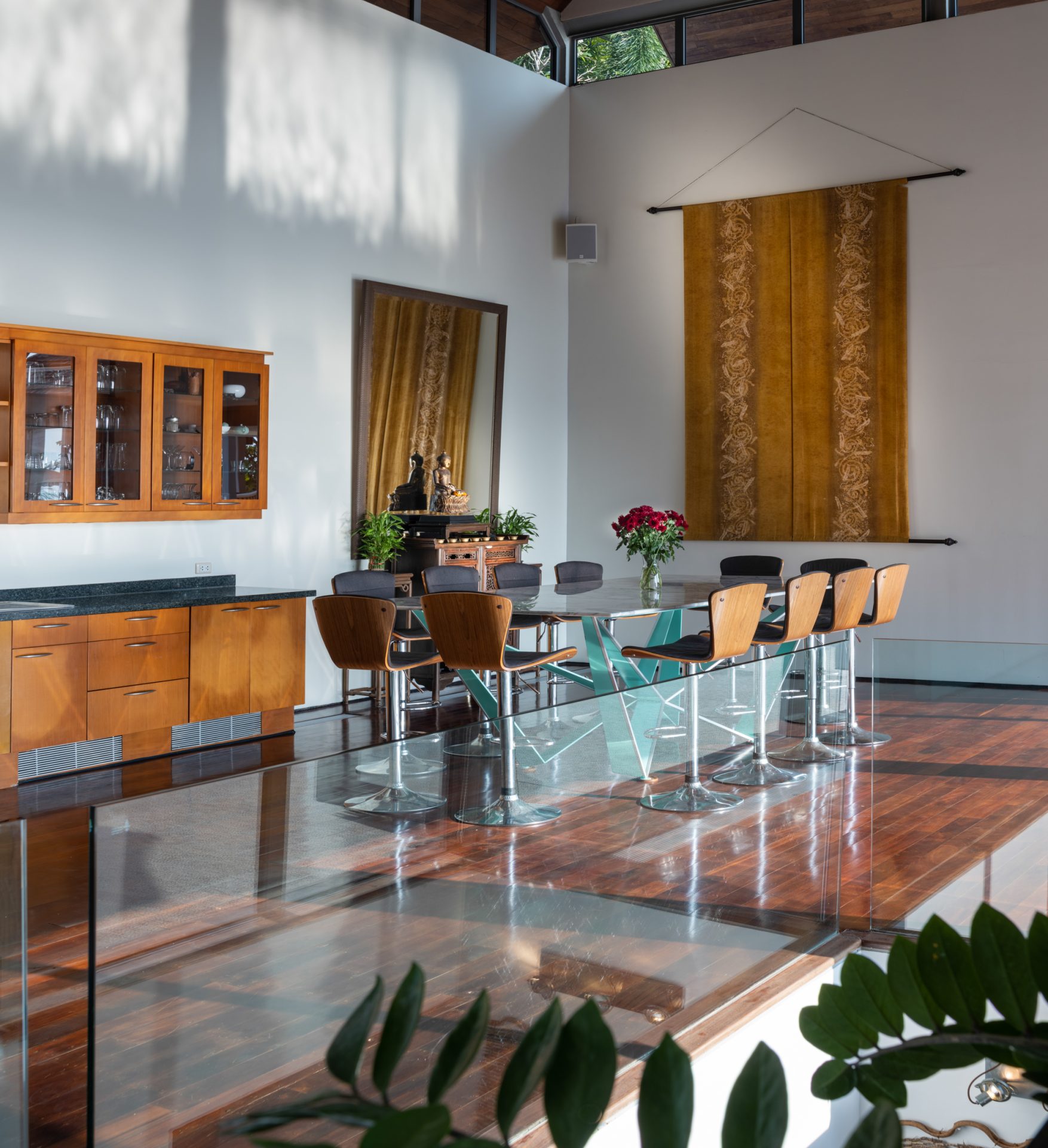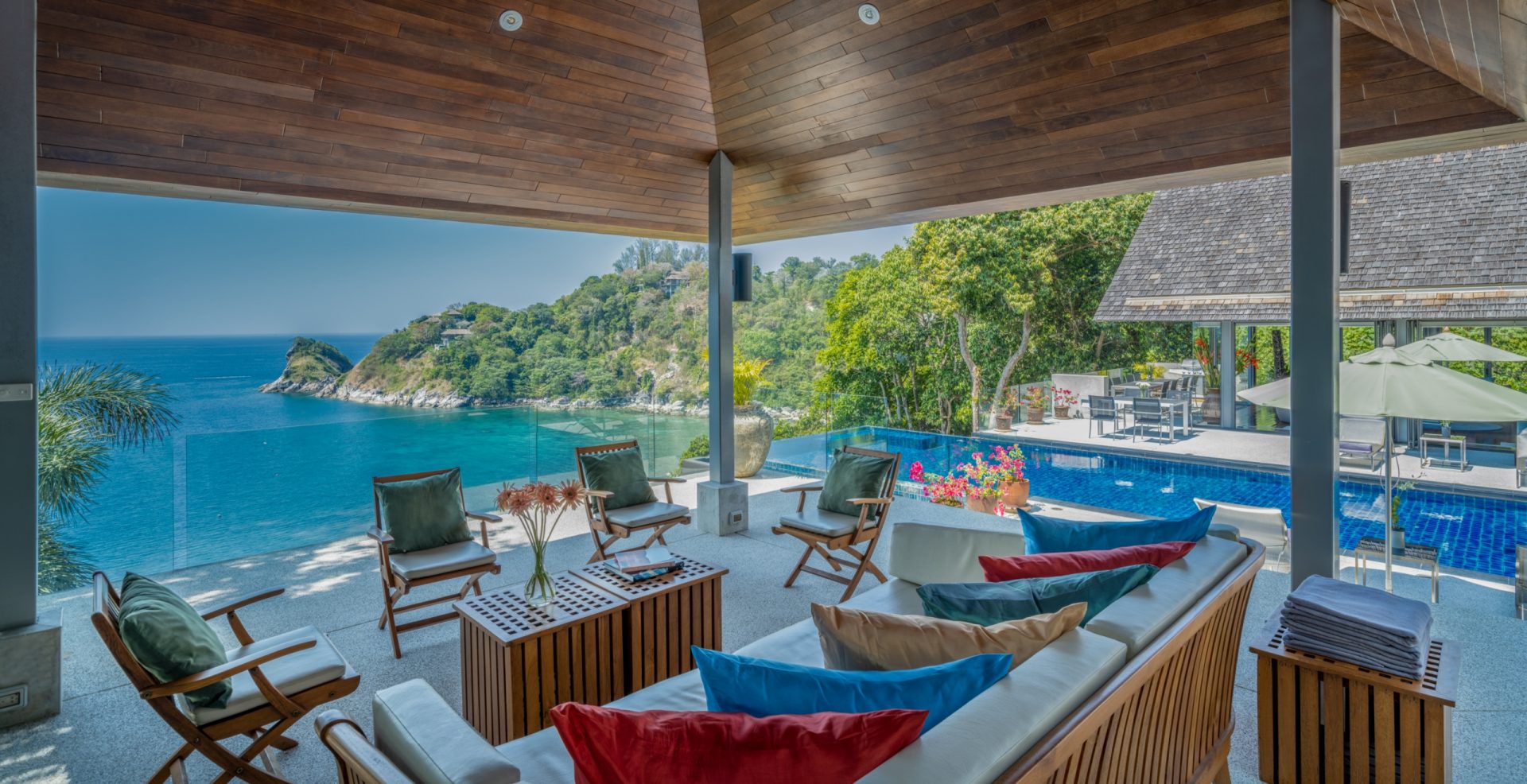 The expansive rooms’ glass doors fold open onto a sun terrace and gorgeous 14-metre infinity pool overlooking the ocean and an outdoor sala. High ceilings, tall glass folding doors and open living spaces create a liberating sense of space throughout the villa. The villa has 5 bedrooms, each opening out to a terrace with splendid views. The villa also features a fully fitted western kitchen and a home theatre.